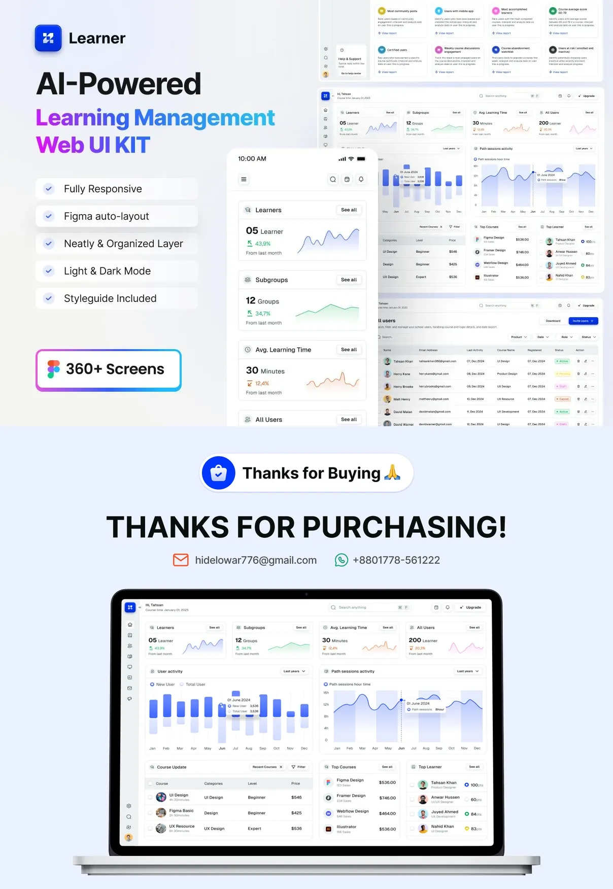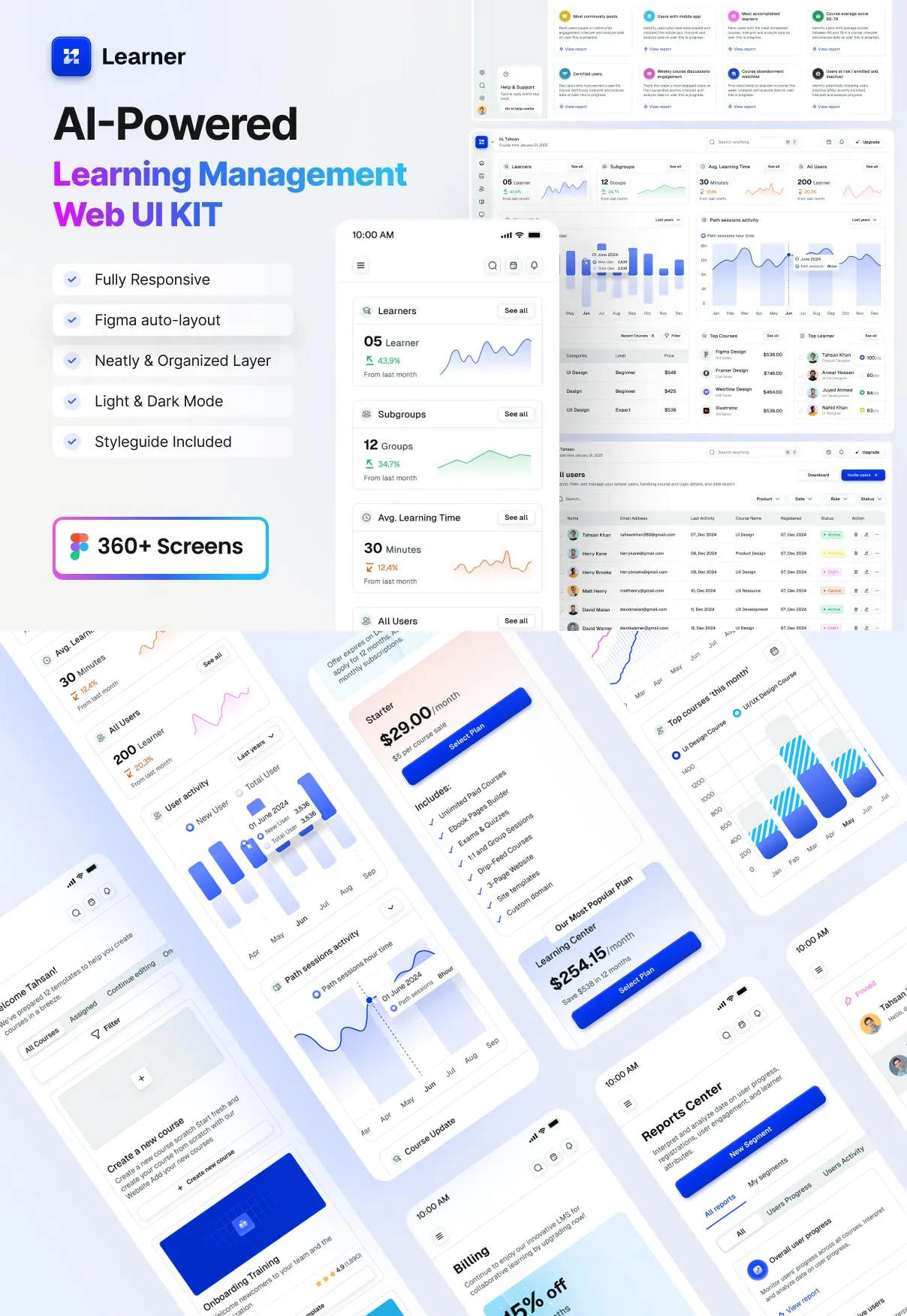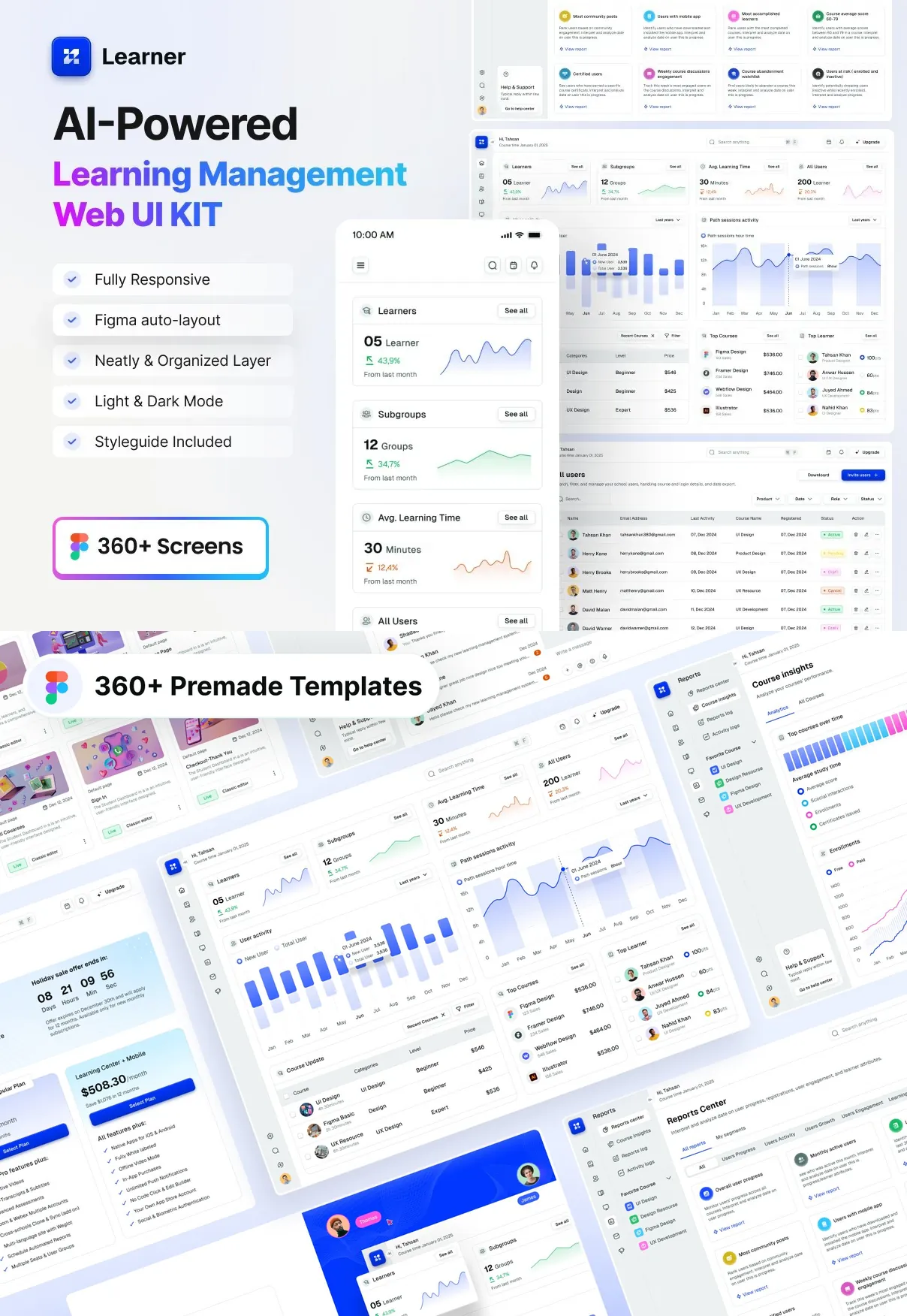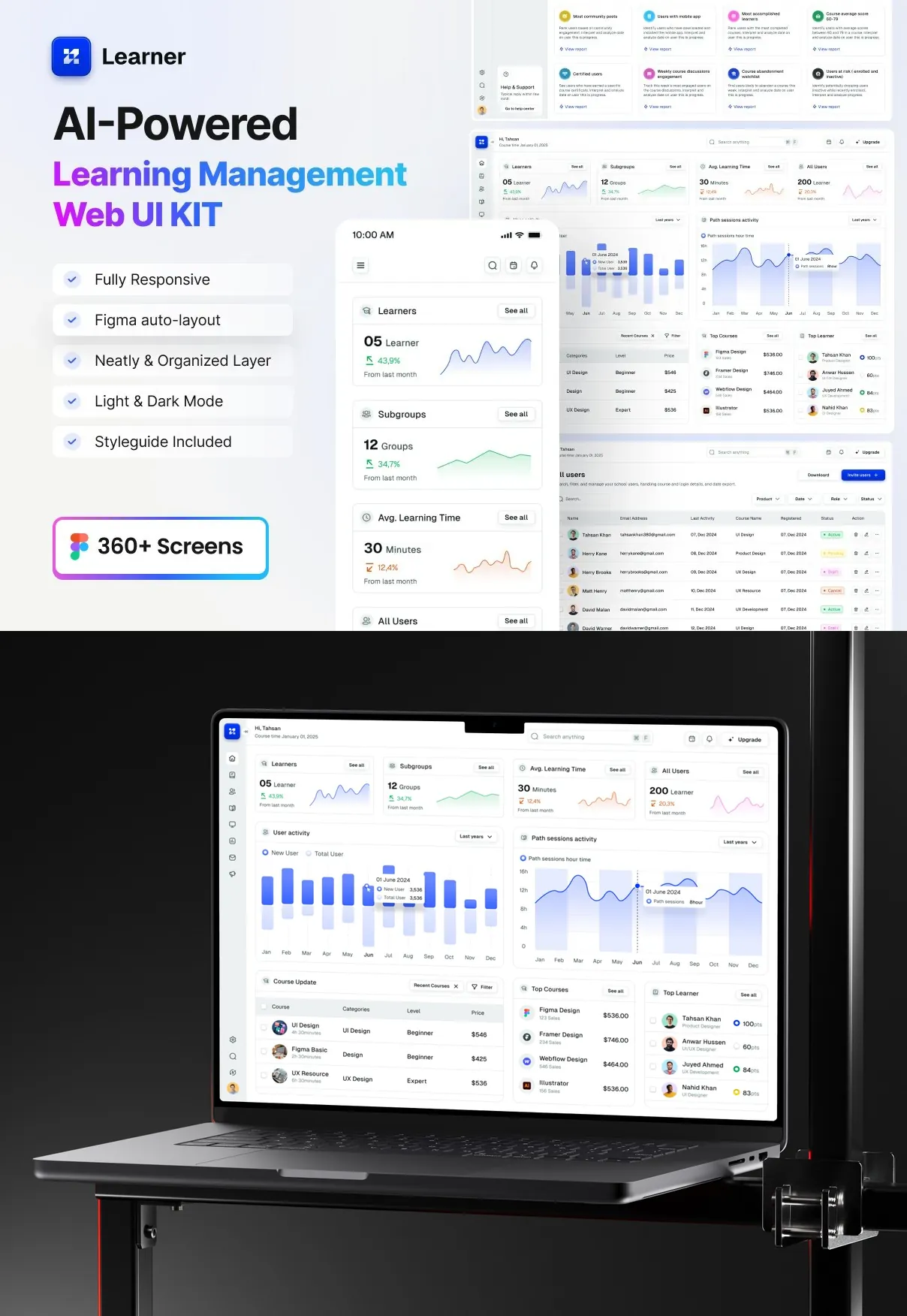 Learner offers an impressive library of over 360 meticulously designed screens that cover every aspect of a modern LMS platform. These screens are crafted with attention to detail and usability, enabling you to build a fully functional and visually appealing education platform quickly. The variety of screens supports diverse user journeys, from course browsing and enrollment to community interaction and performance analytics.