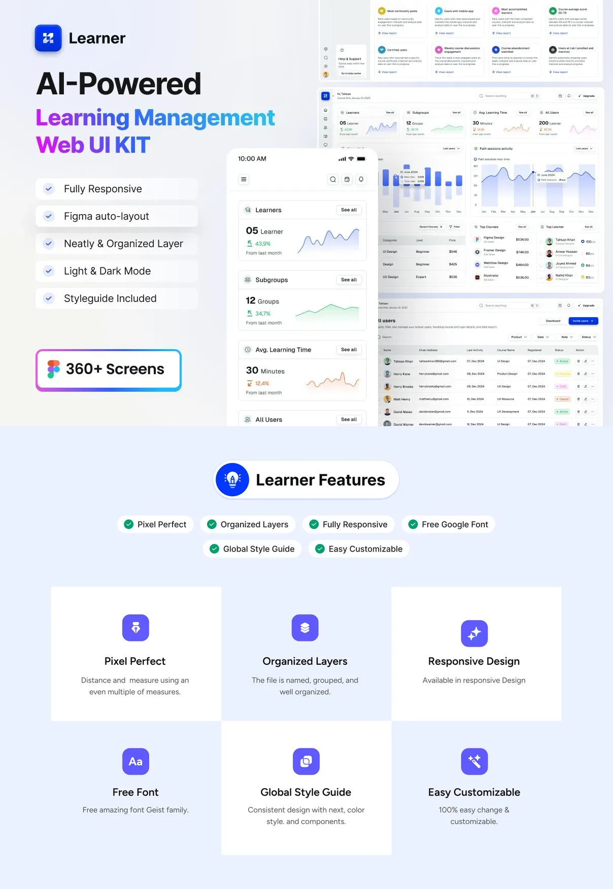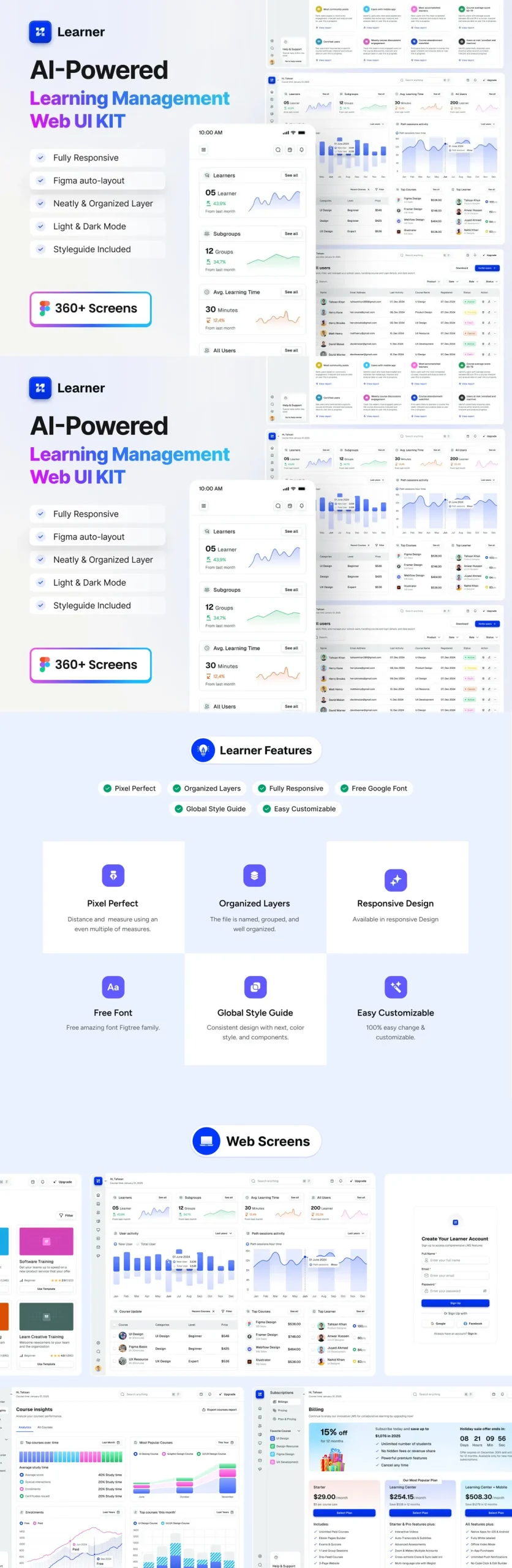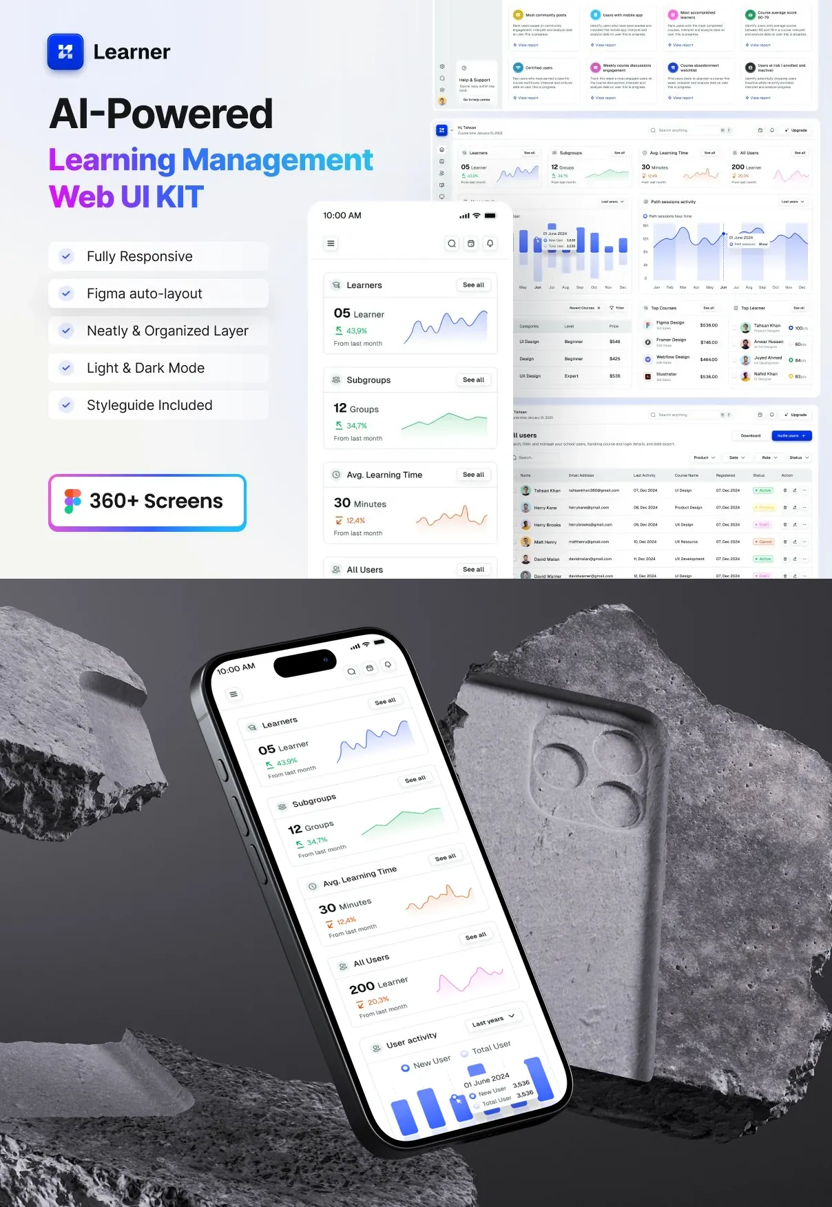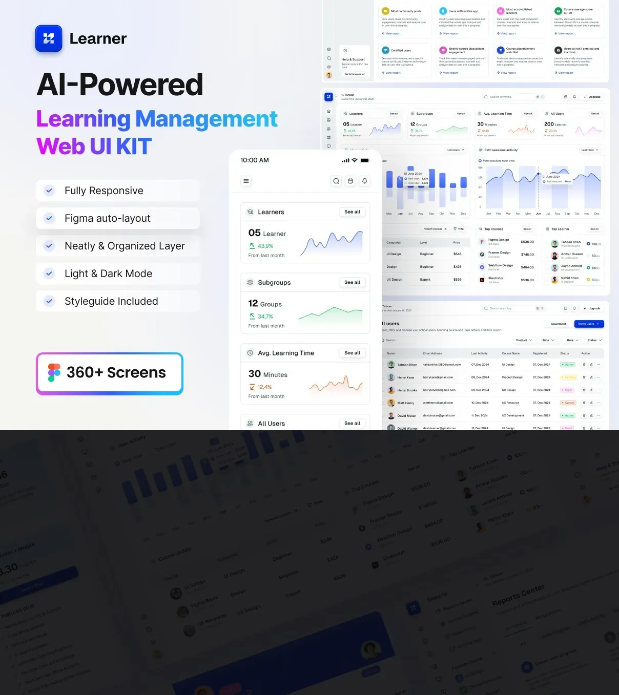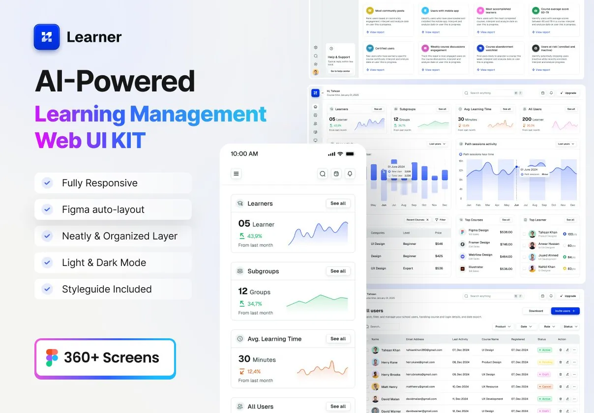 Learner offers an impressive library of over 360 meticulously designed screens that cover every aspect of a modern LMS platform. These screens are crafted with attention to detail and usability, enabling you to build a fully functional and visually appealing education platform quickly. The variety of screens supports diverse user journeys, from course browsing and enrollment to community interaction and performance analytics.