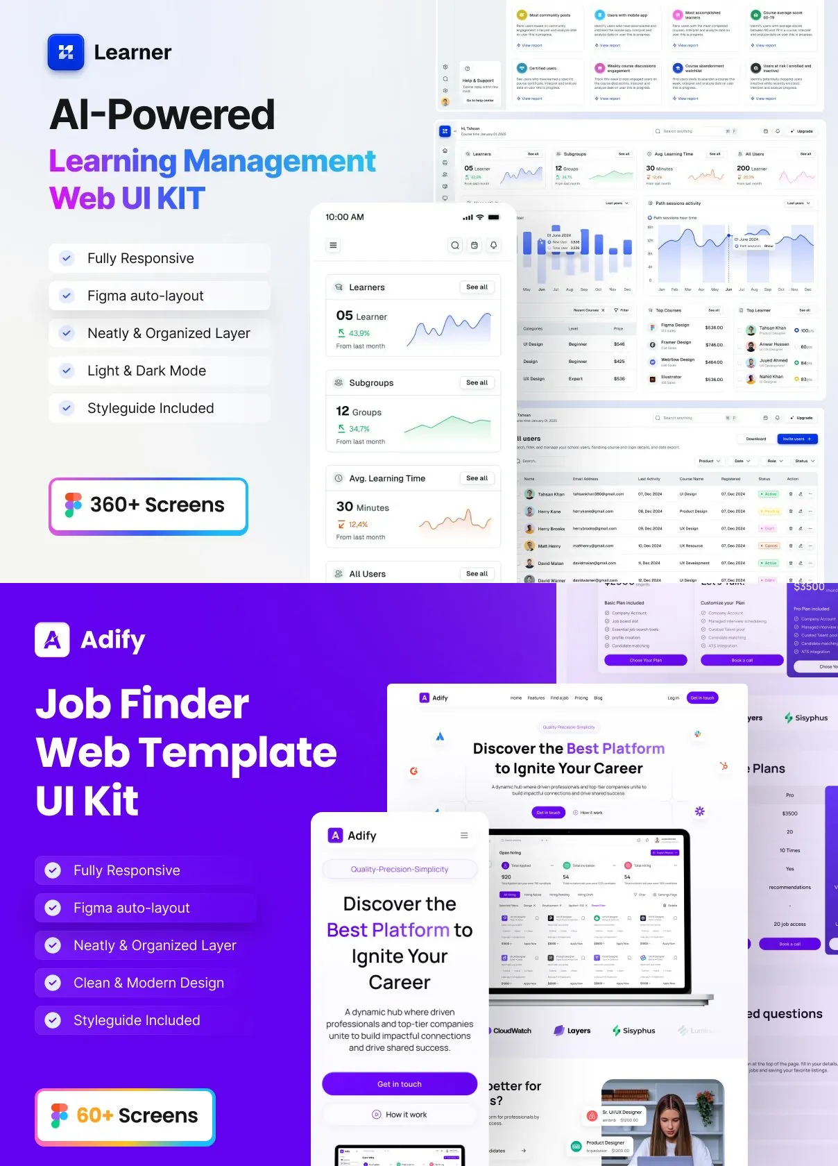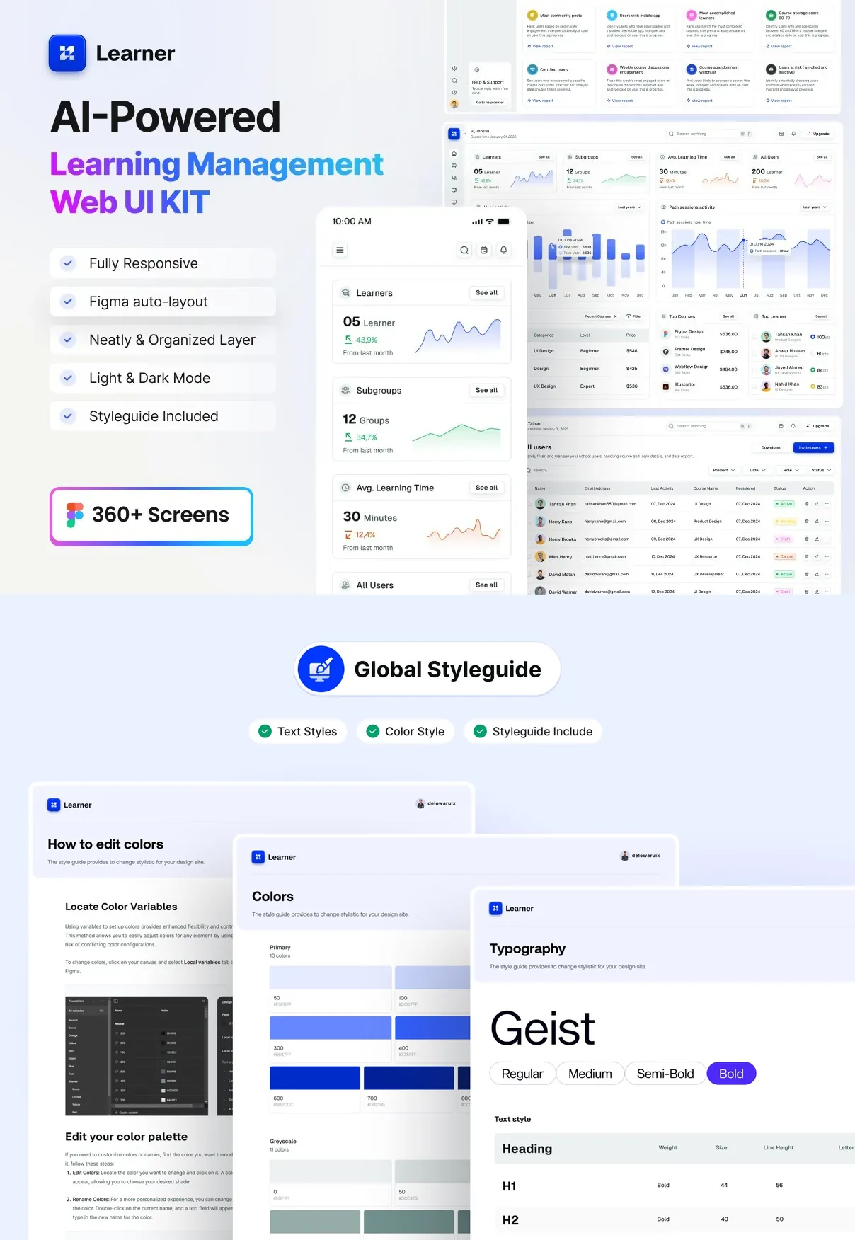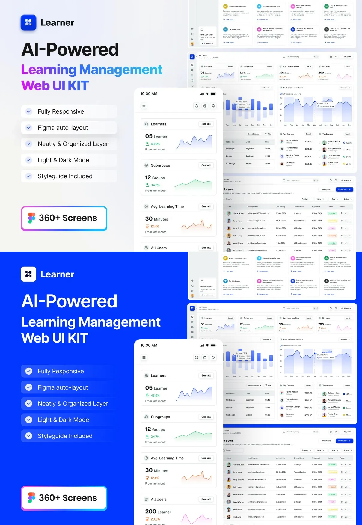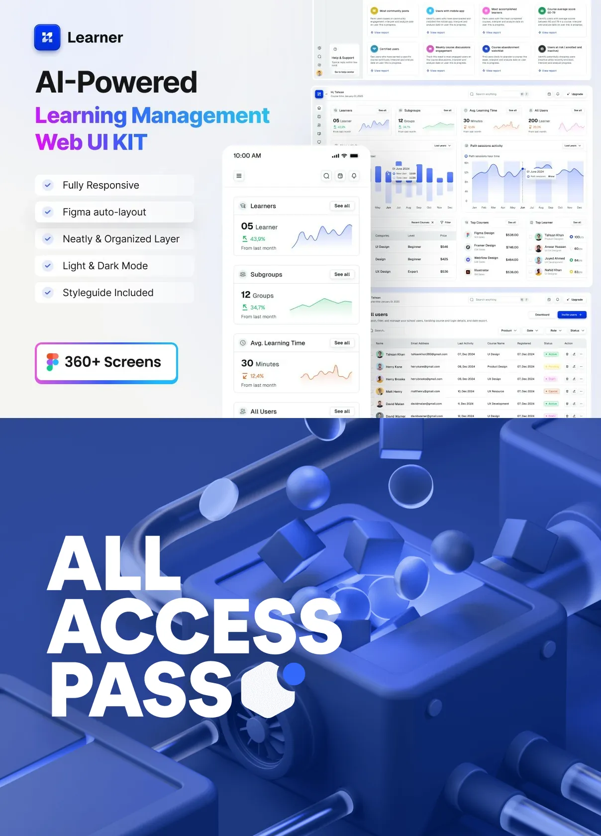 Learner offers an impressive library of over 360 meticulously designed screens that cover every aspect of a modern LMS platform. These screens are crafted with attention to detail and usability, enabling you to build a fully functional and visually appealing education platform quickly. The variety of screens supports diverse user journeys, from course browsing and enrollment to community interaction and performance analytics.