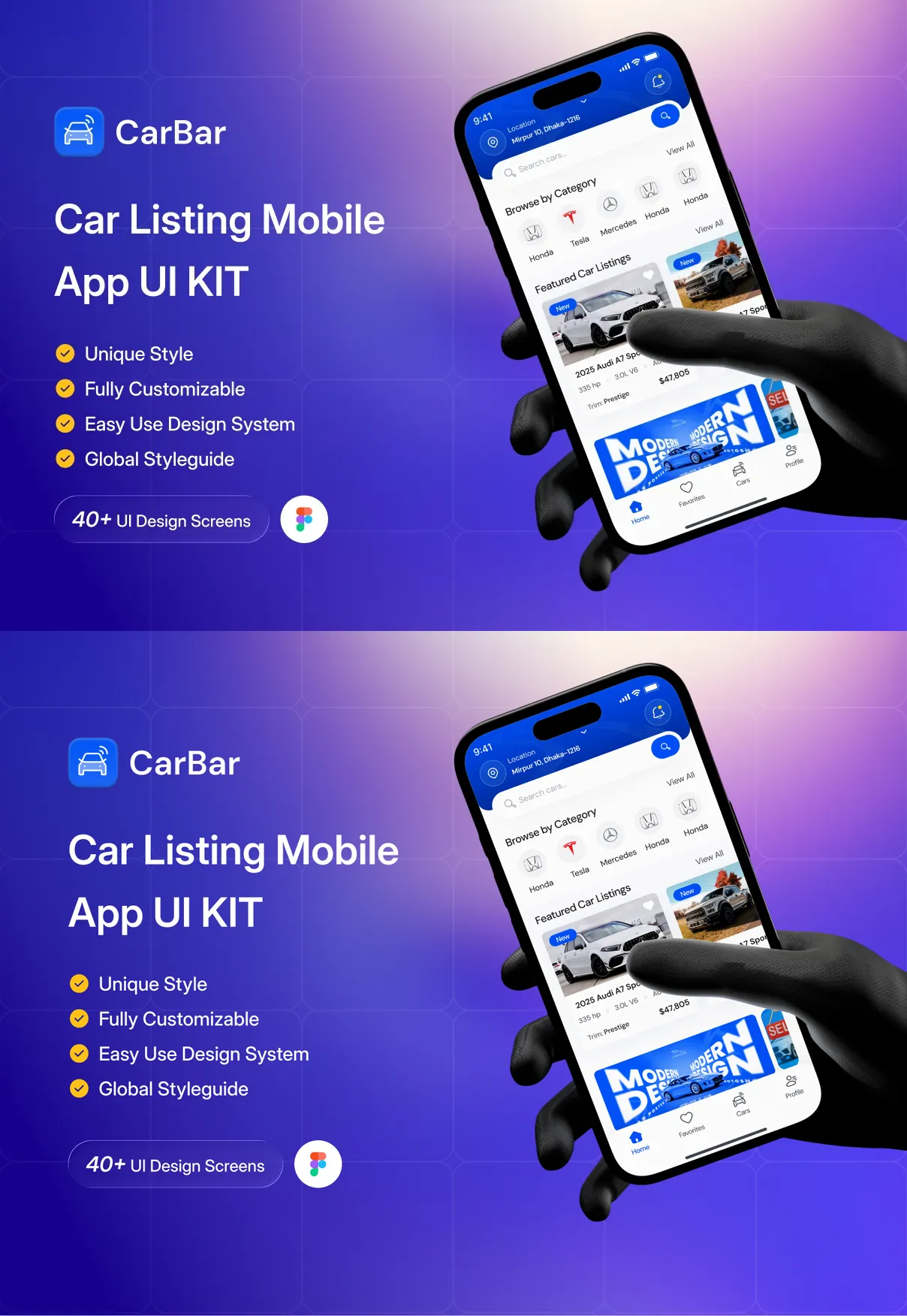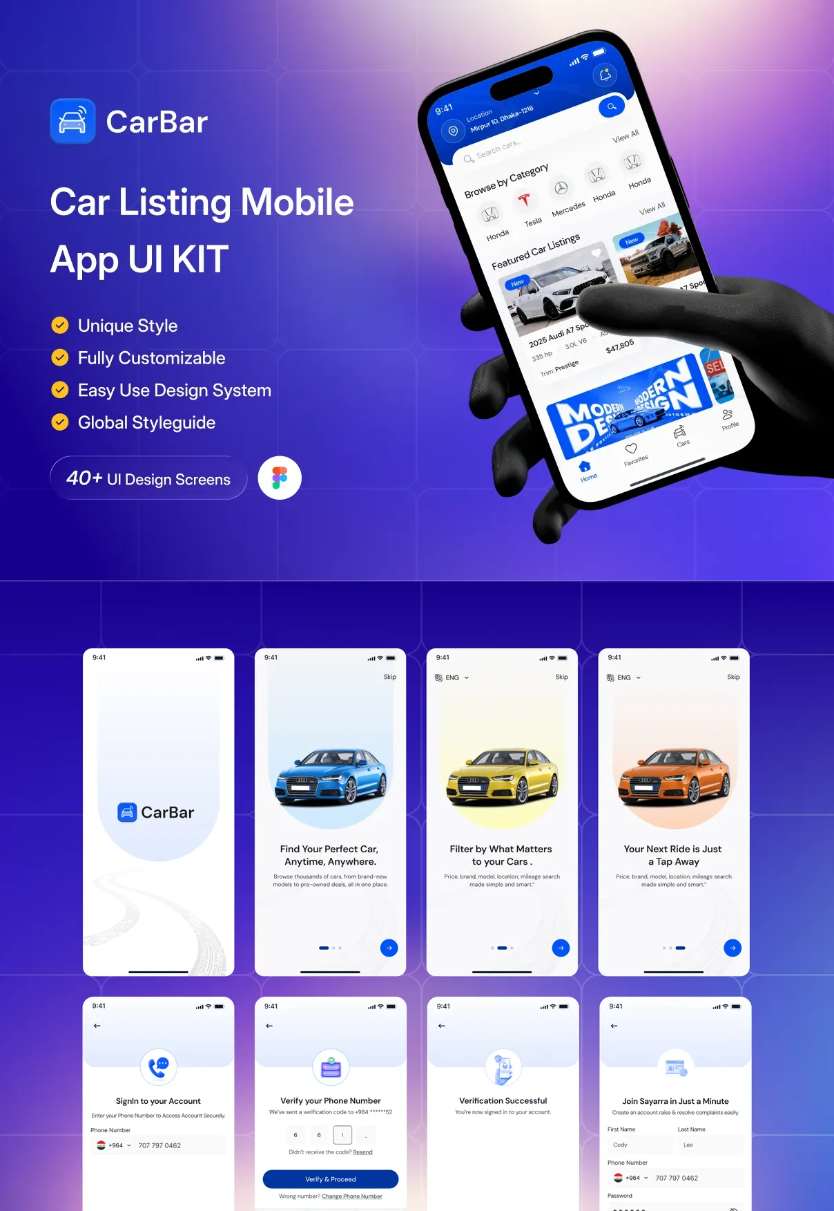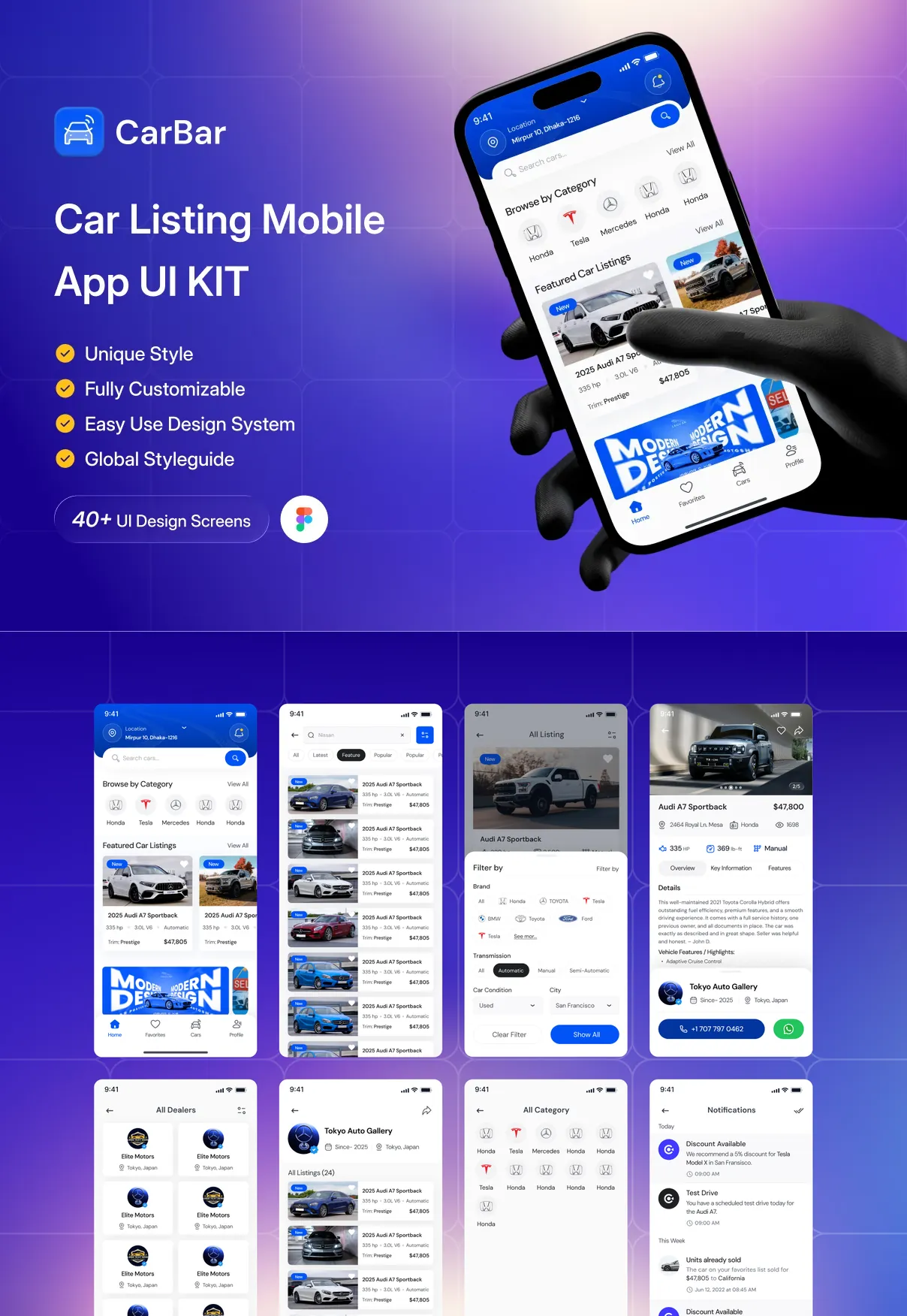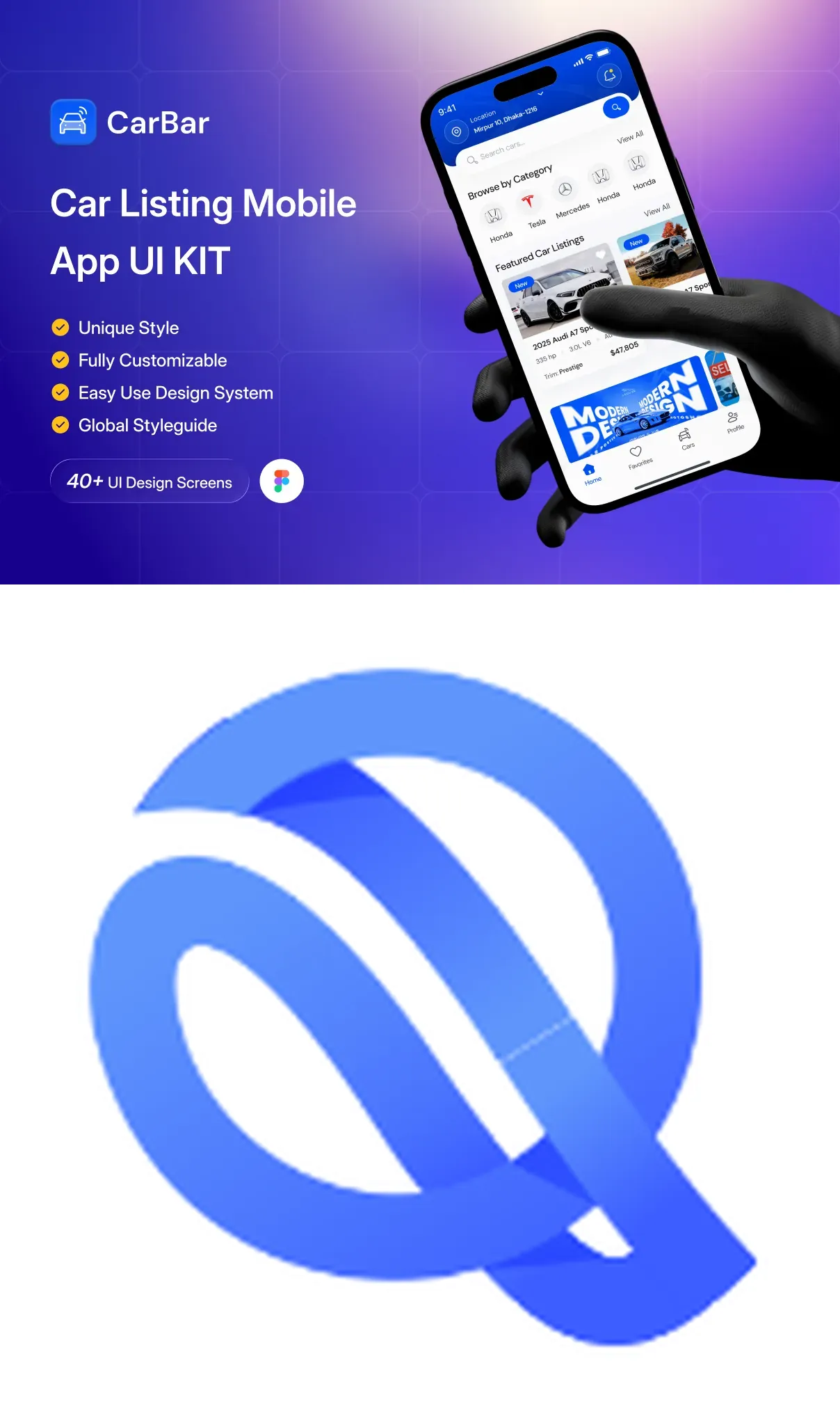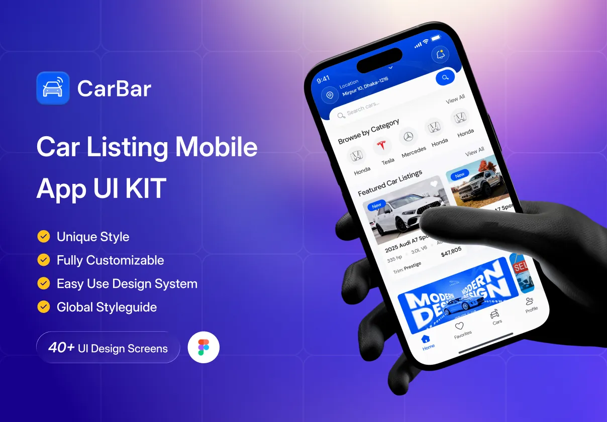 CarBar is a modern and professionally designed Car Listing Mobile App UI Kit created to help designers and developers build powerful automotive marketplace applications with ease. Crafted with a clean layout, structured components, and a scalable design system, CarBar delivers a smooth and intuitive user experience for browsing, discovering, and listing vehicles.