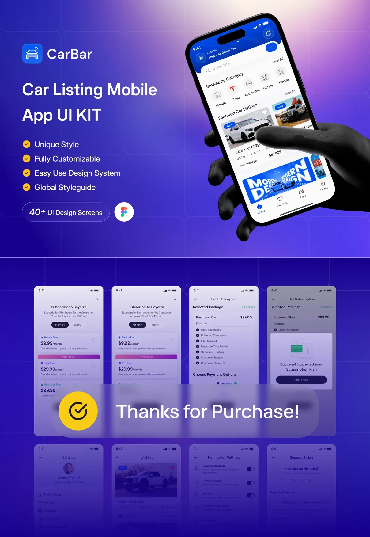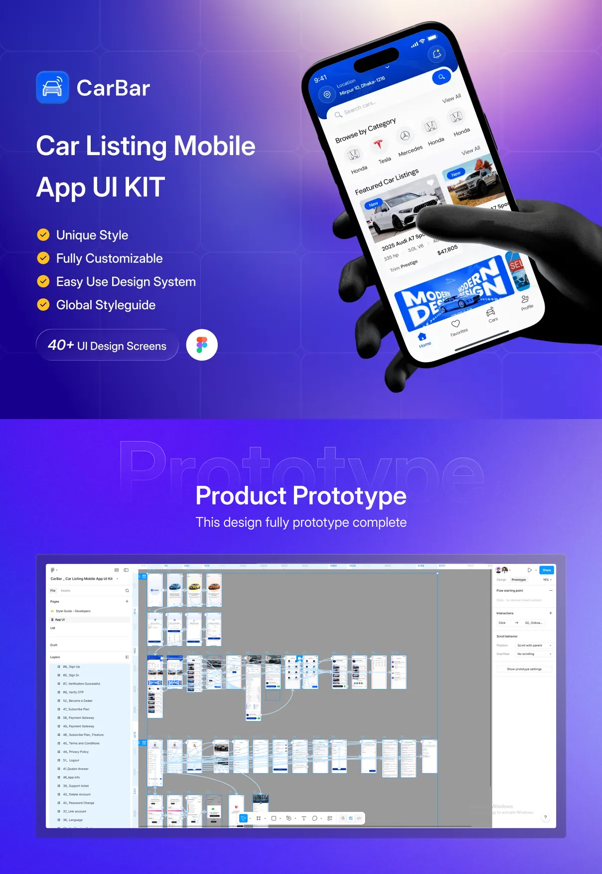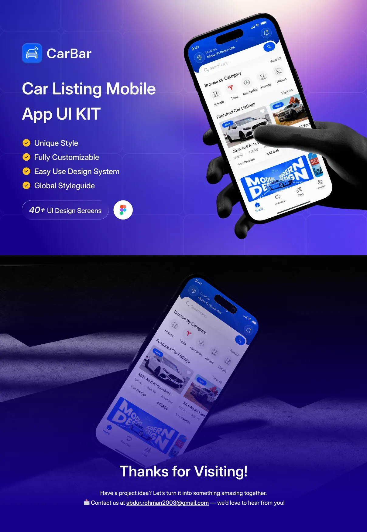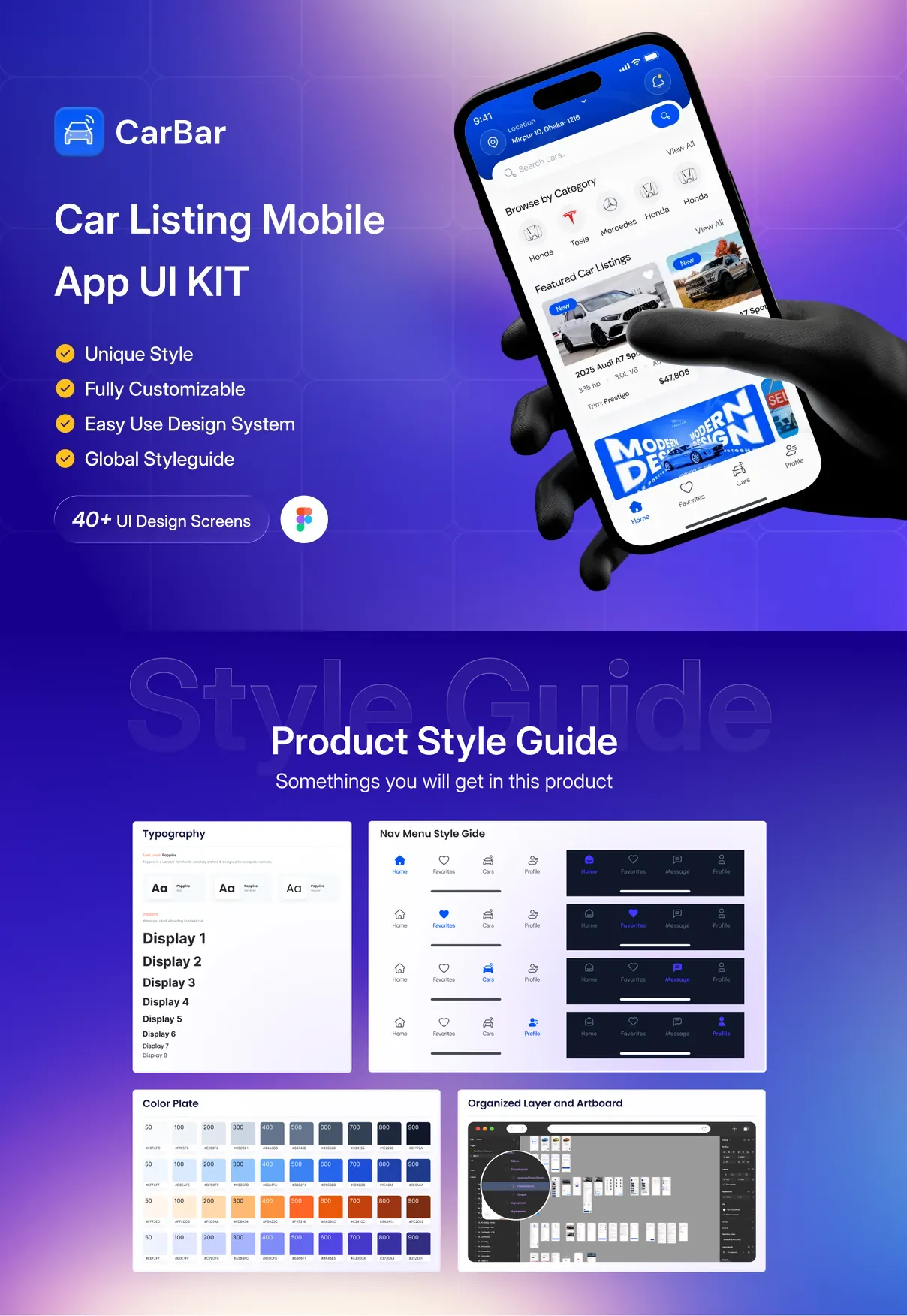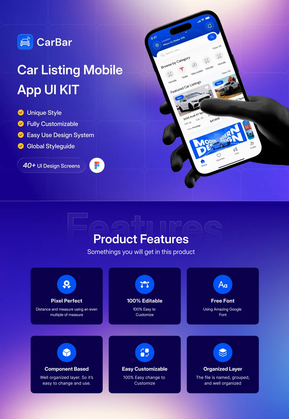 CarBar is a modern and professionally designed Car Listing Mobile App UI Kit created to help designers and developers build powerful automotive marketplace applications with ease. Crafted with a clean layout, structured components, and a scalable design system, CarBar delivers a smooth and intuitive user experience for browsing, discovering, and listing vehicles.