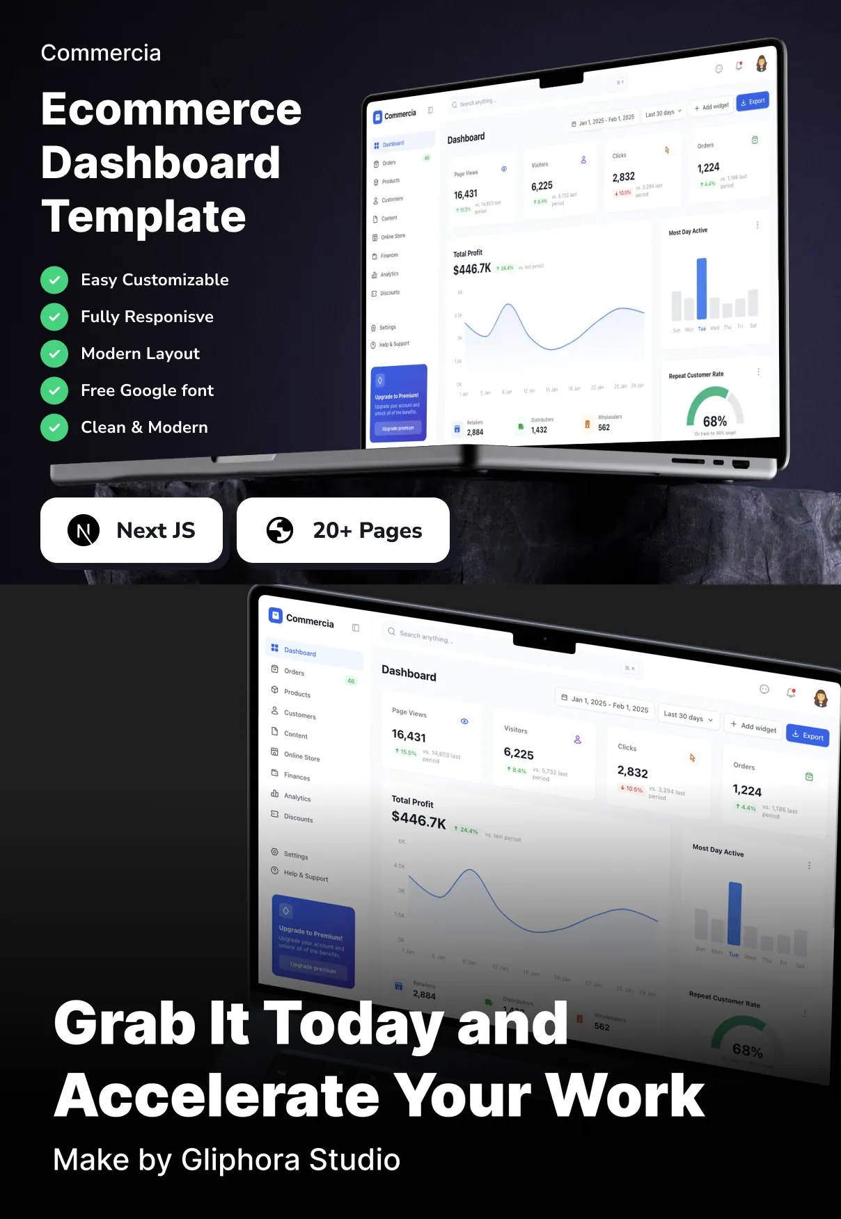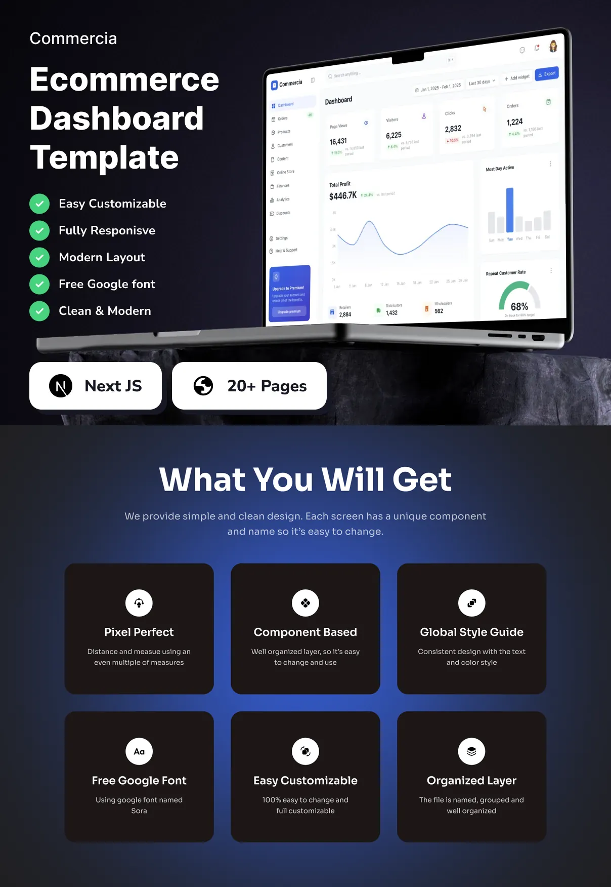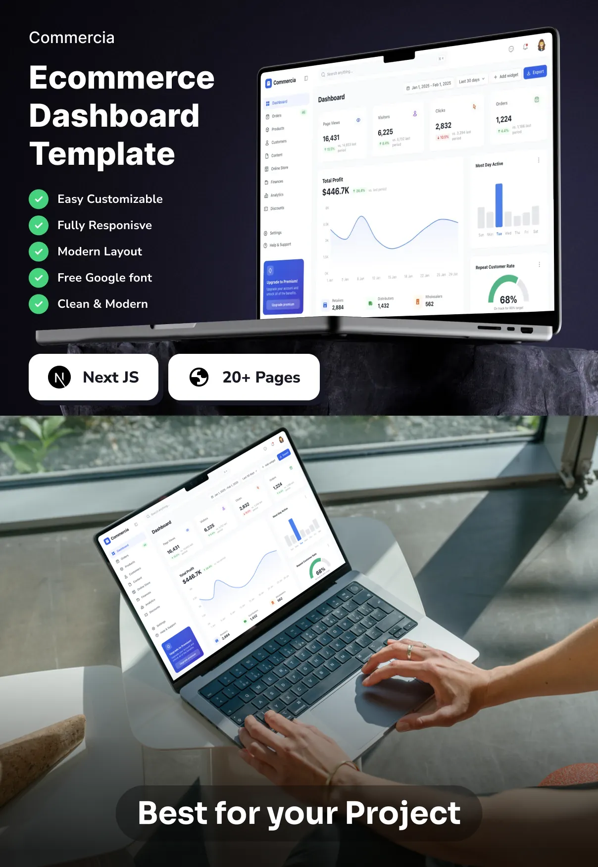 Built with a well-structured component system and reusable layouts, Commercia helps developers accelerate development when building ecommerce admin panels, analytics dashboards, inventory systems, and order management tools. Every element is crafted for flexibility, making it easy to customize and scale for real-world SaaS and production-ready applications.
