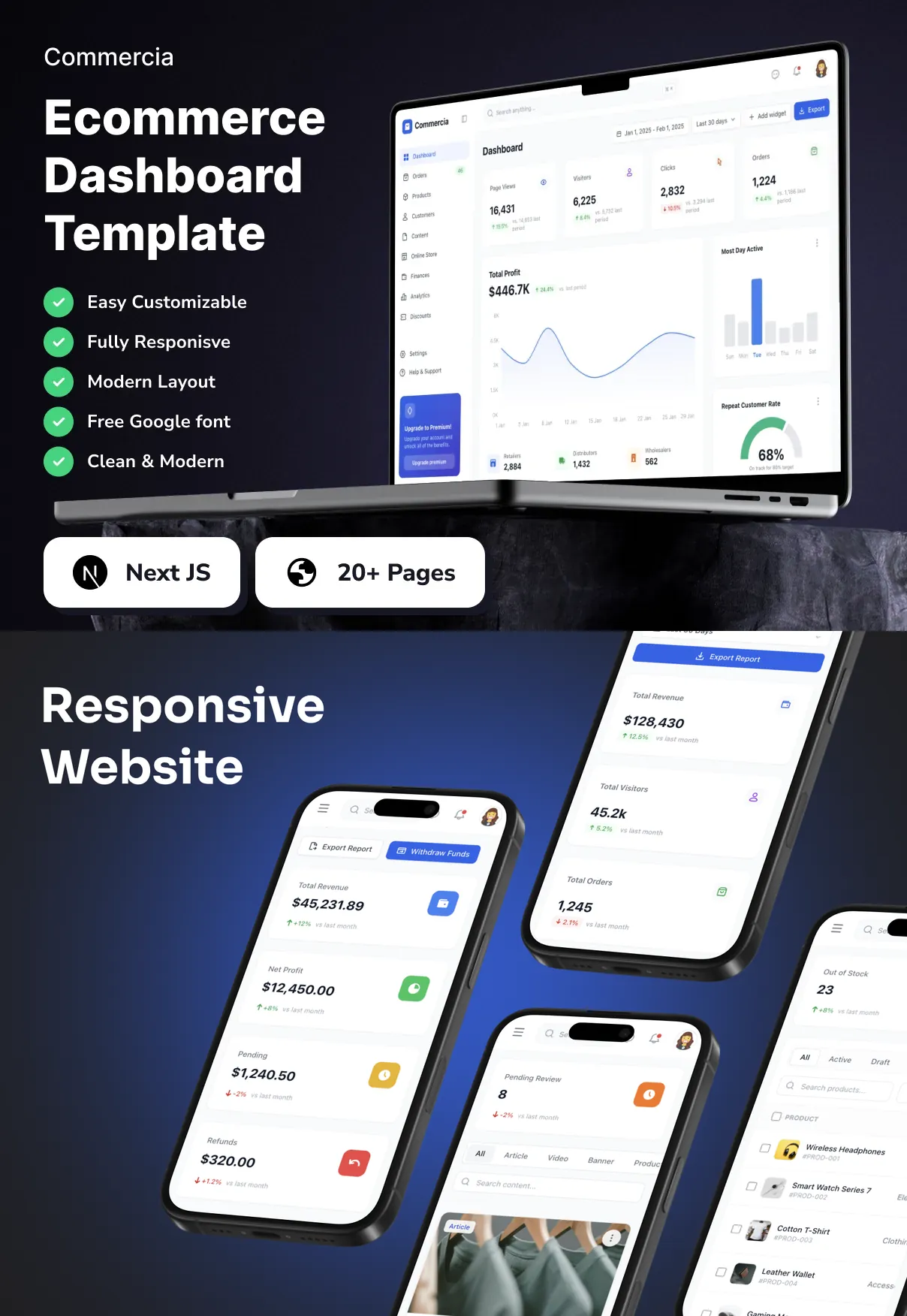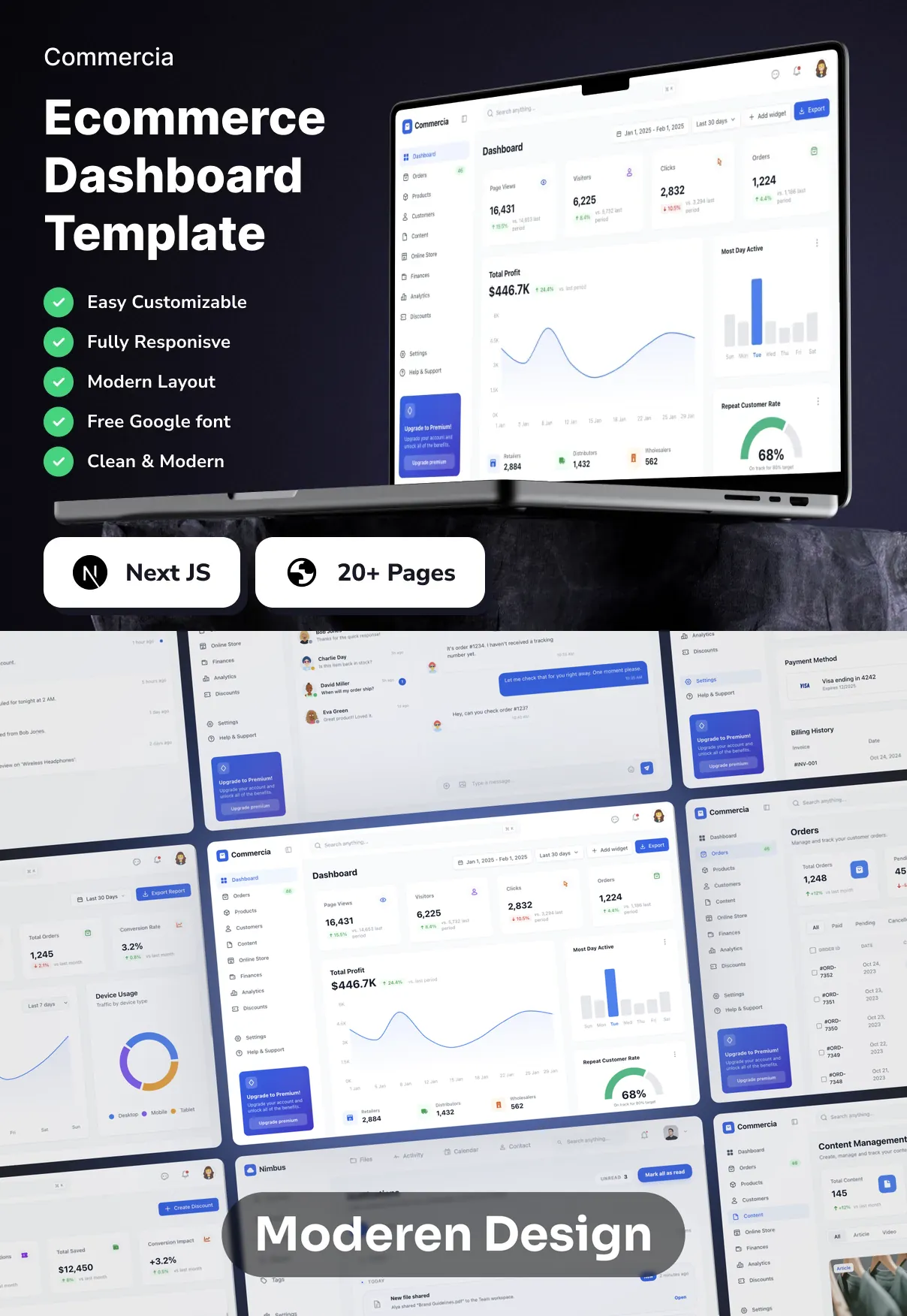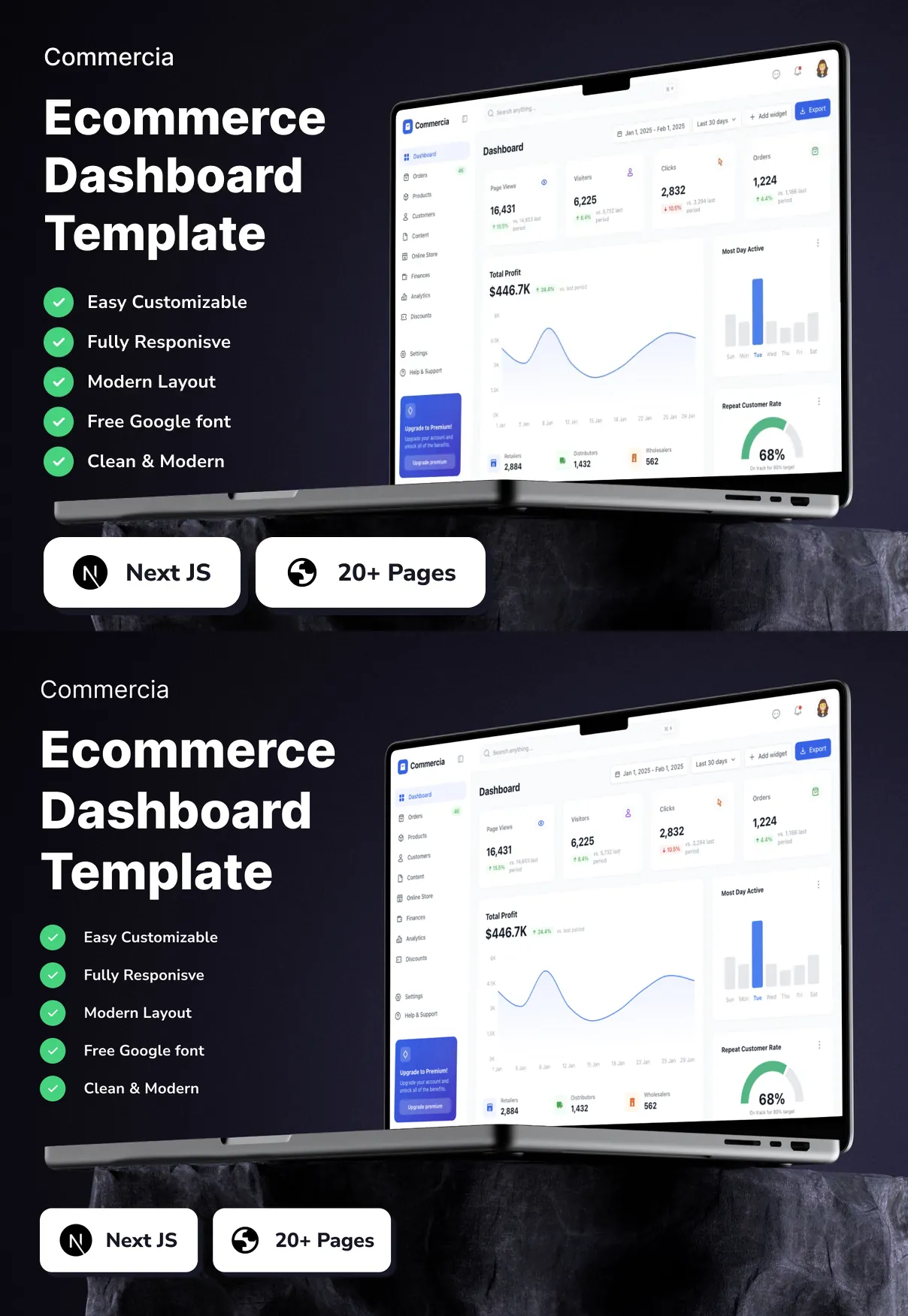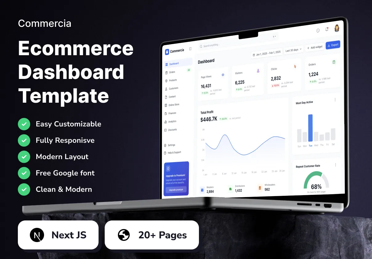 Commercia is a modern and scalable Ecommerce Dashboard Template built with Next.js, designed to power online stores, marketplaces, and multi-vendor platforms. With 20+ fully designed pages, it provides a complete solution for managing products, orders, customers, and business performance in a clean and efficient interface.