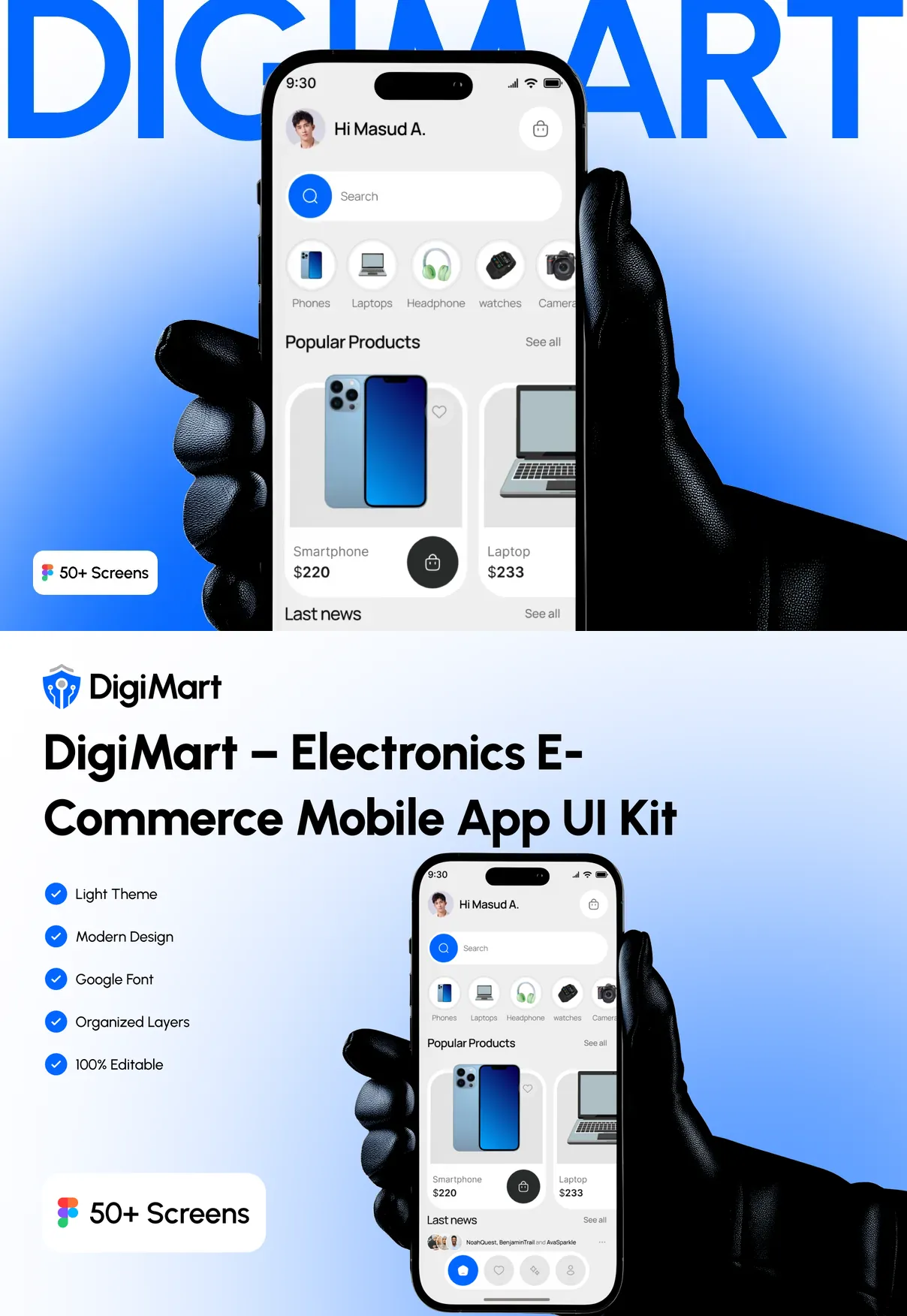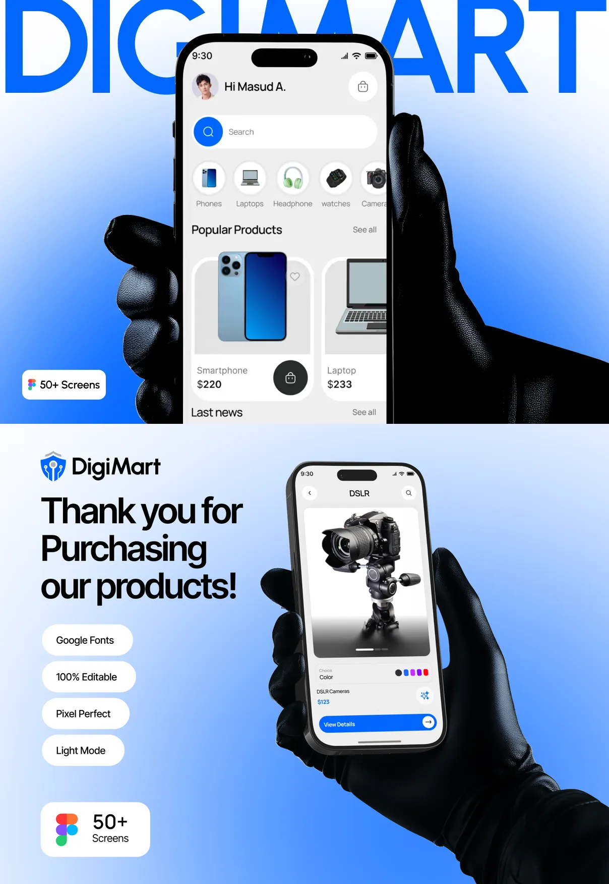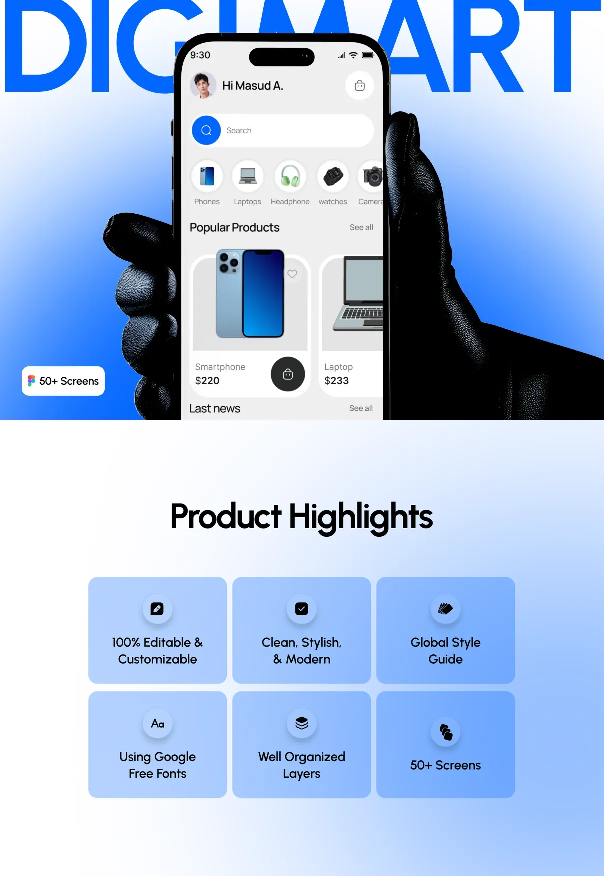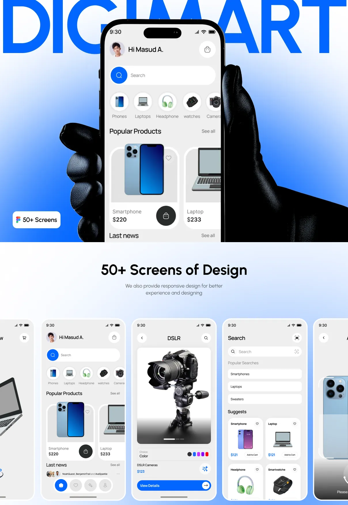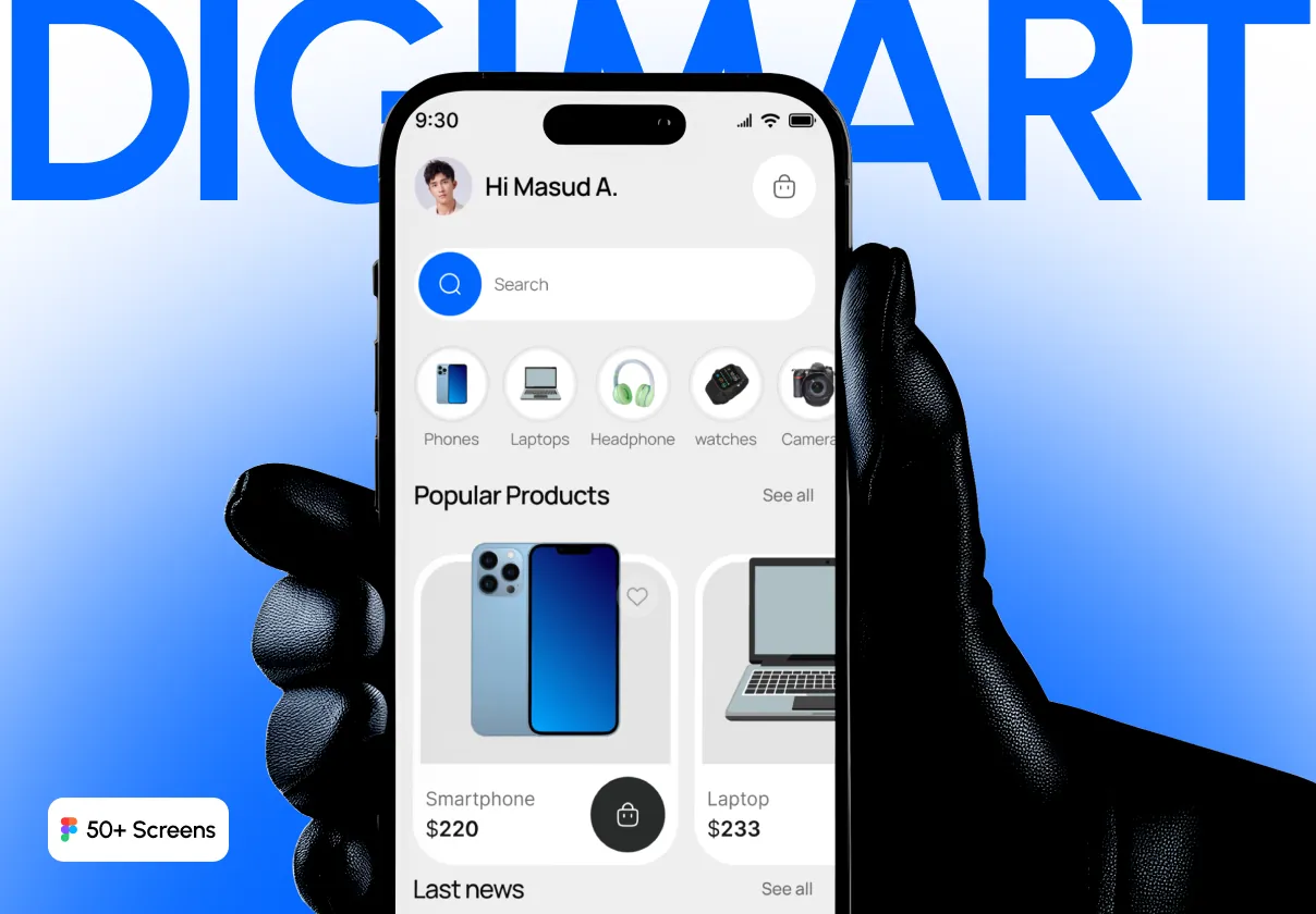 Perfect for electronics stores, gadget marketplaces, and tech-focused e-commerce startups, DigiMart UI Kit provides a strong design foundation to build a scalable, reliable, and modern digital shopping experience.