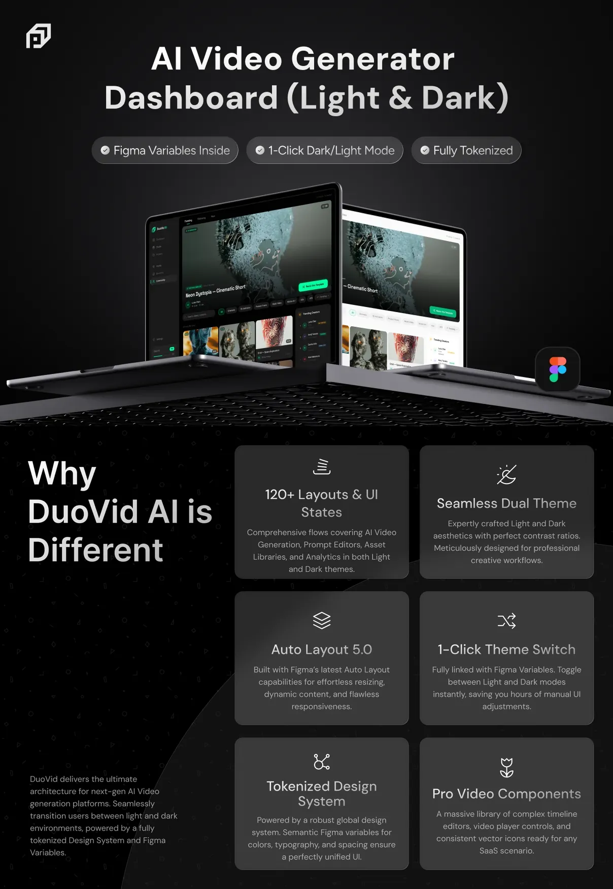 Say goodbye to manual adjustments. DuoVid is fully powered by Figma Variables. Every color, gap, and radius is tokenized. Toggle instantly between our meticulously crafted Light and Dark modes with a single click. It’s ready for immediate handoff to your front-end team (Tailwind/CSS variables ready!).