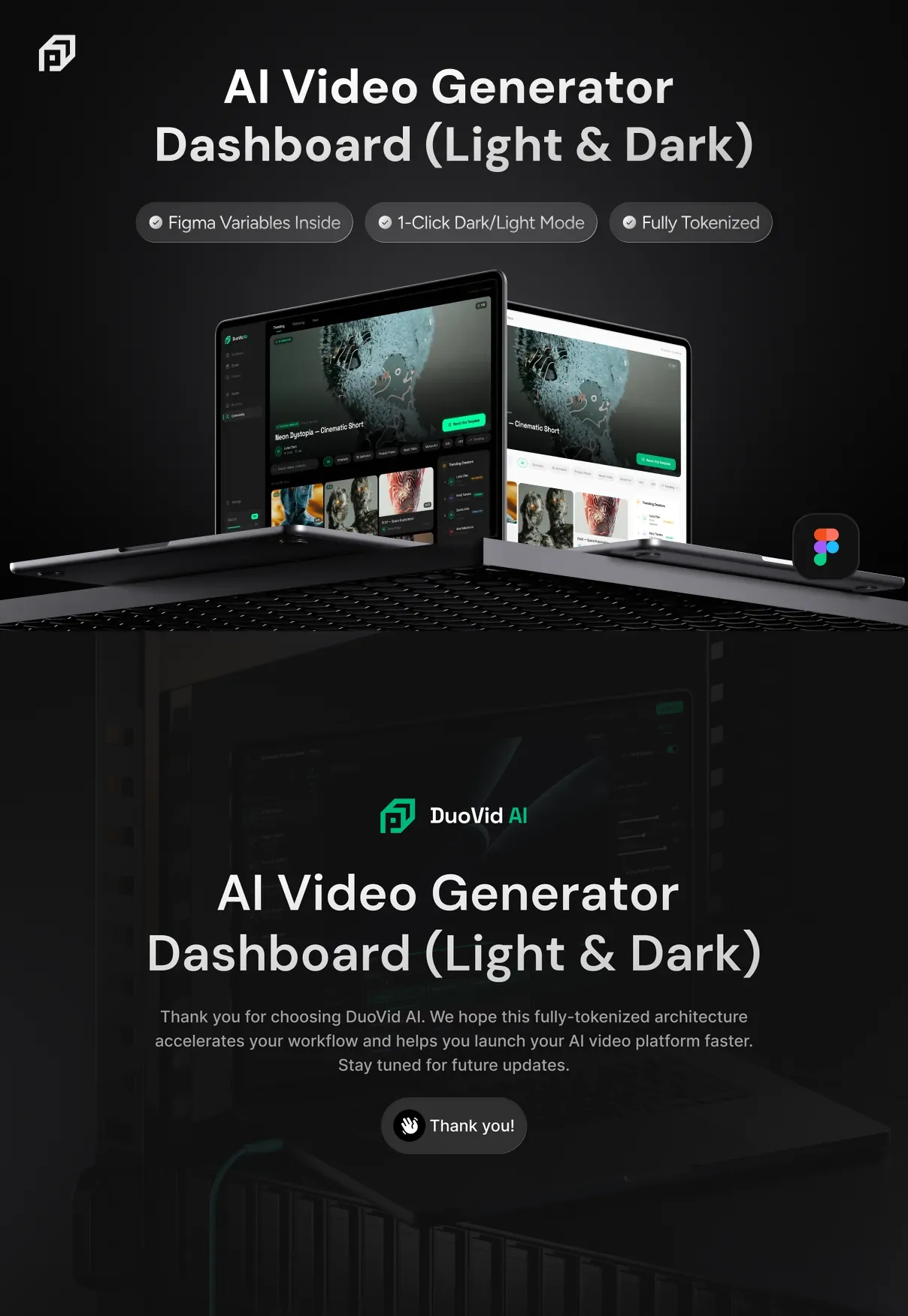 The AI video revolution is here, but building a professional, high-performance dashboard from scratch takes hundreds of hours. DuoVid AI is a world-class, closed-loop design system built specifically for AI Video Generators, Prompt-to-Video platforms, and Creative SaaS tools.