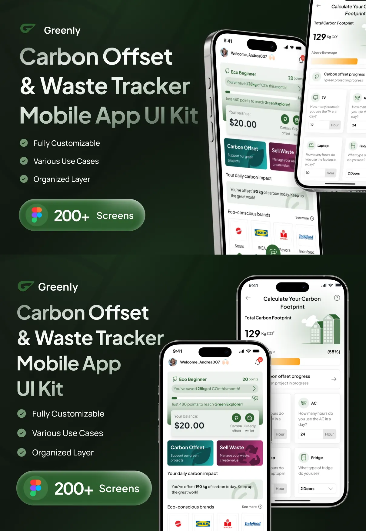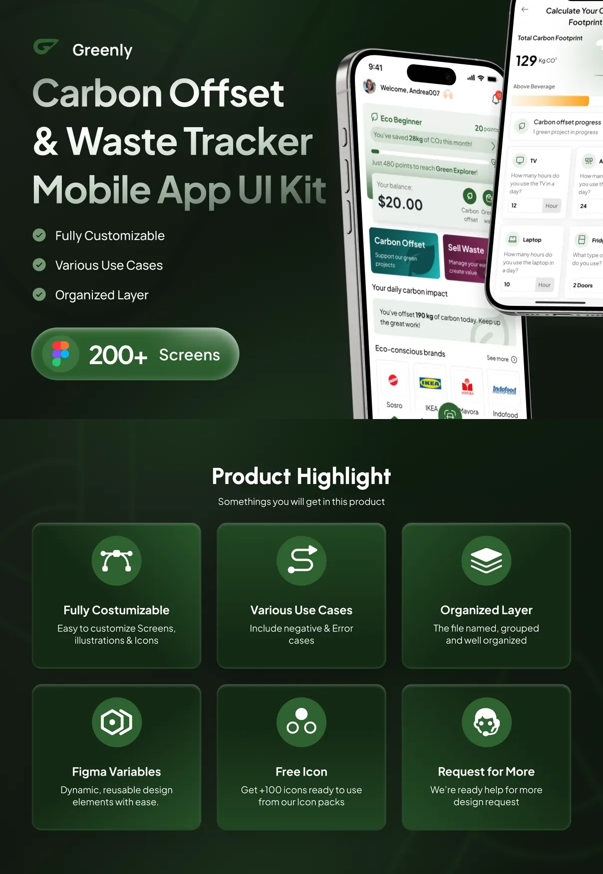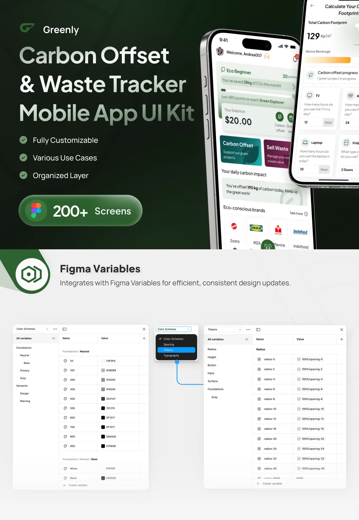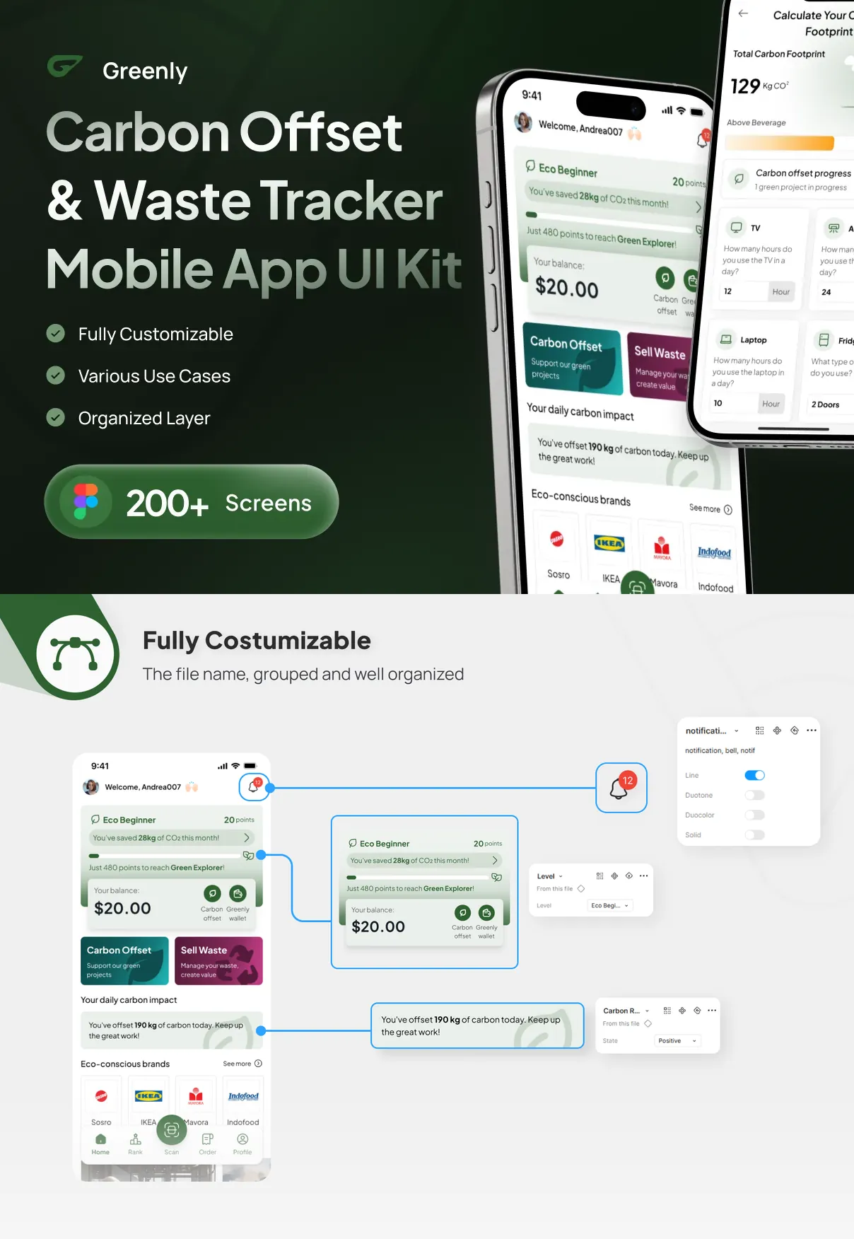 Every element in Greenly’s UI kit is 100% customizable to fit your brand’s unique style. Designers can easily adjust colors, typography, layouts, and interactive components using the provided Figma files, which support auto-layouts, grids, and variables for streamlined customization.