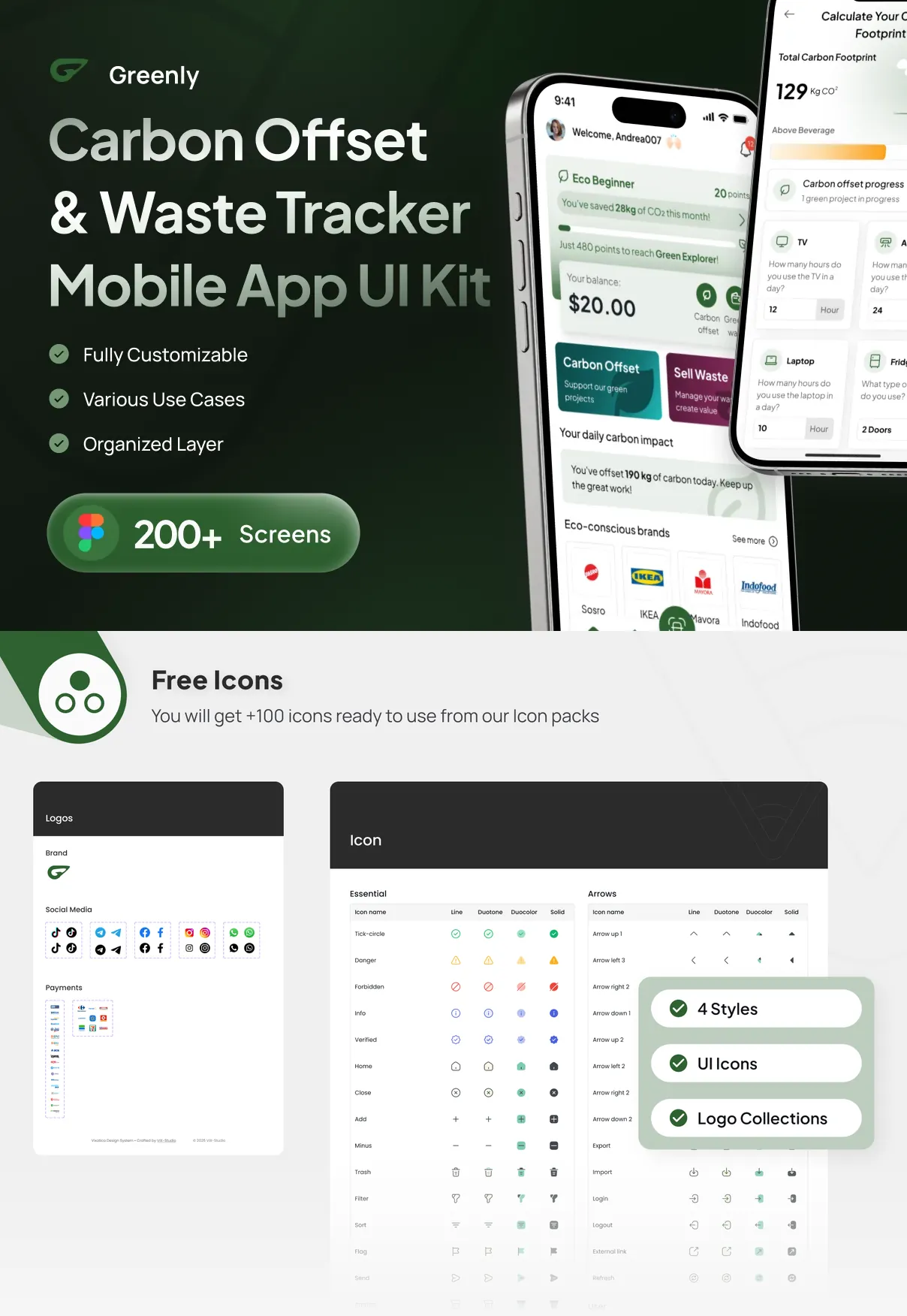 Greenly comes with a complete style guide and a curated set of free icons to maintain design consistency and speed up the development process. This ensures all your app screens adhere to a cohesive visual language that resonates with eco-conscious audiences.