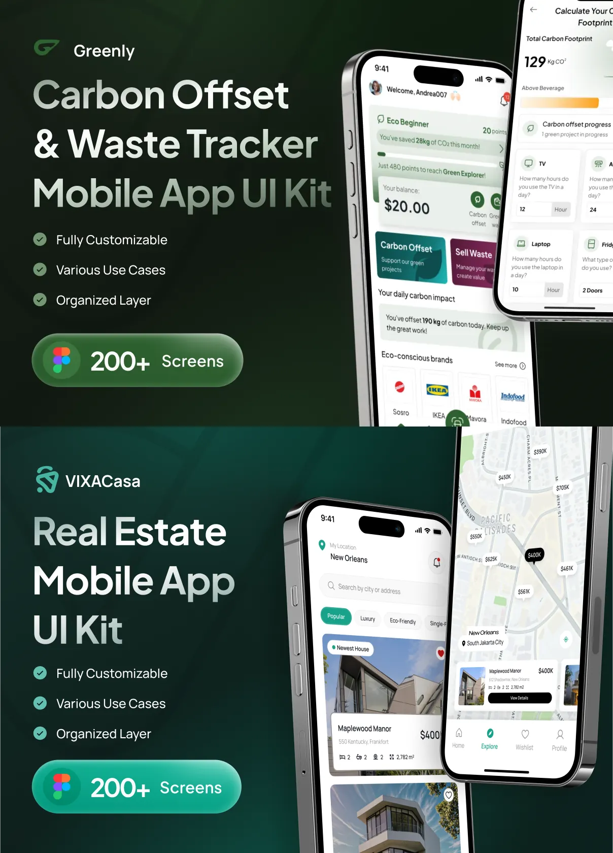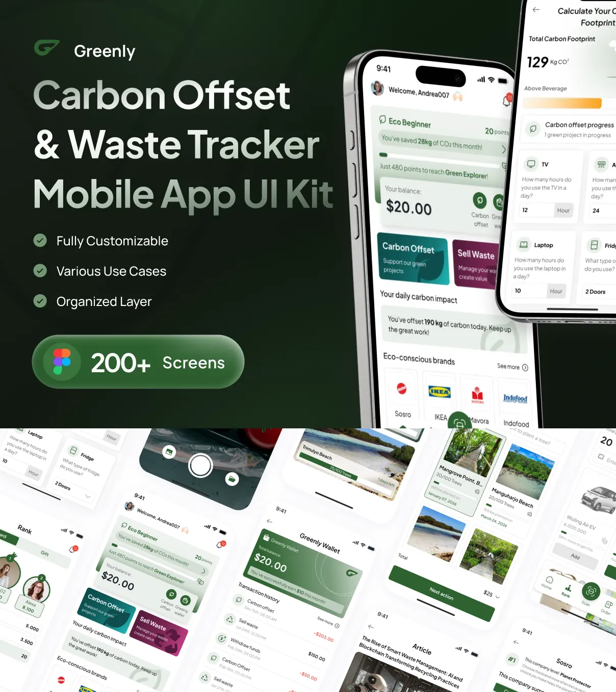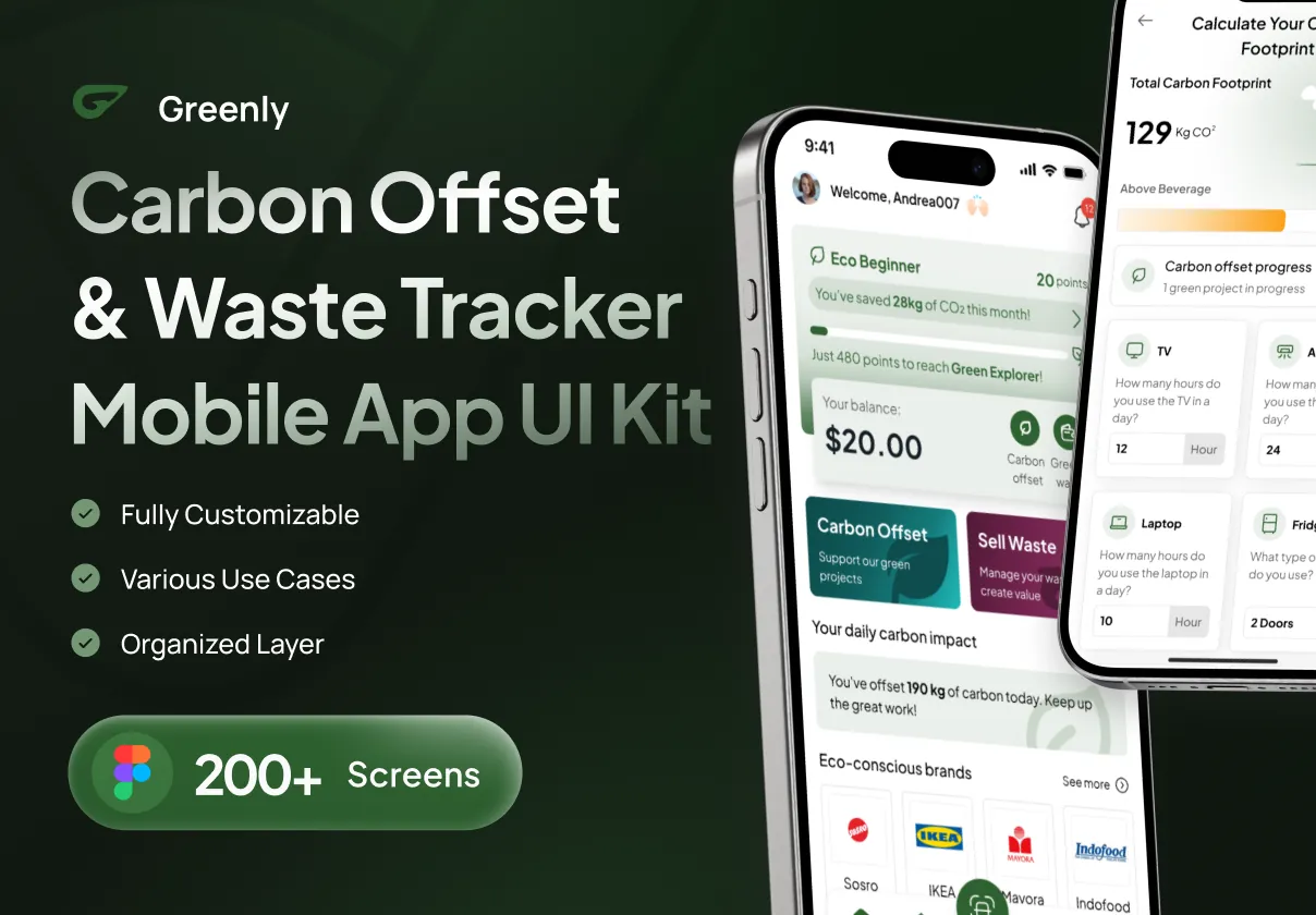 Greenly includes an expansive library of meticulously designed screens covering every aspect of an eco app’s functionality. From onboarding and user profiles to tracking dashboards and community interaction, this kit ensures your project delivers a seamless, professional user experience.